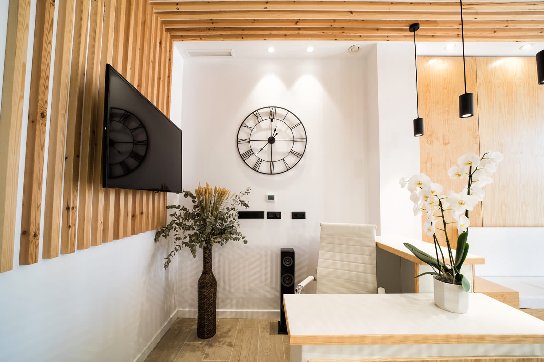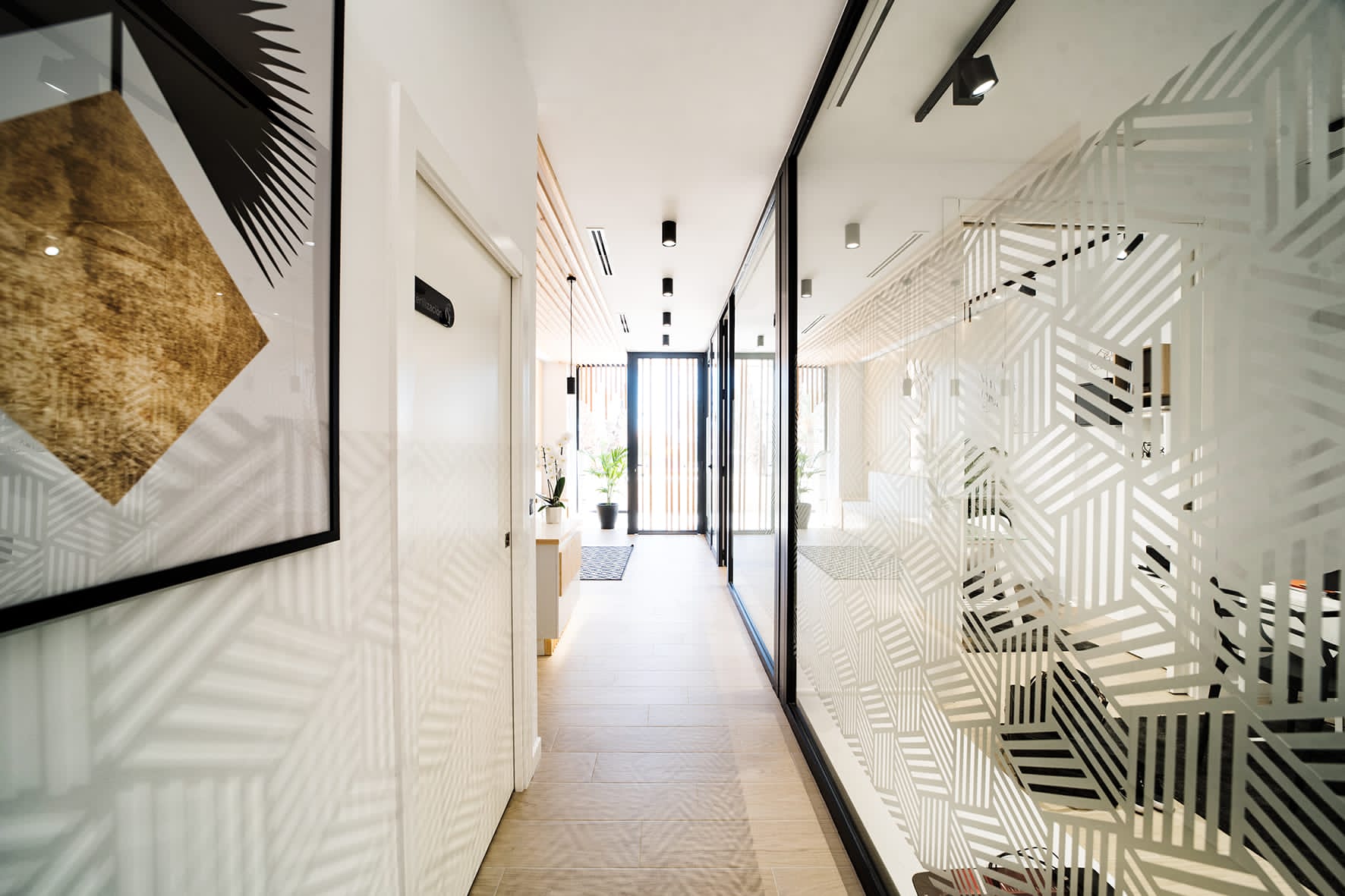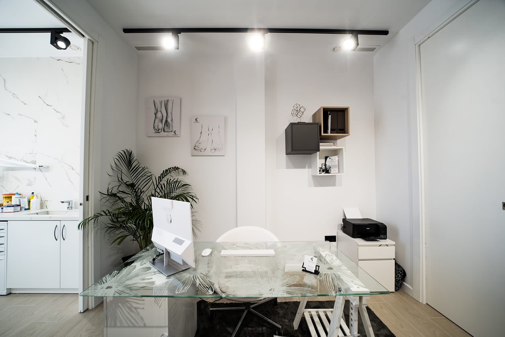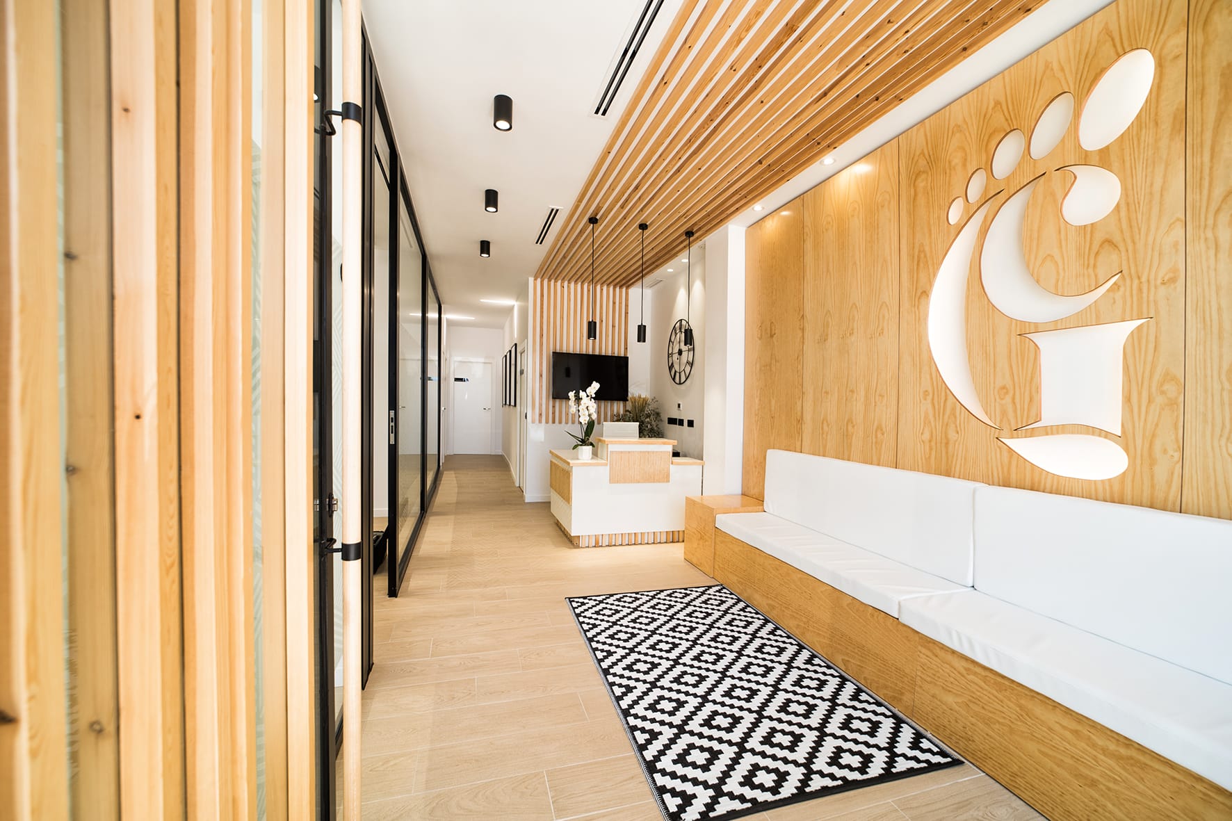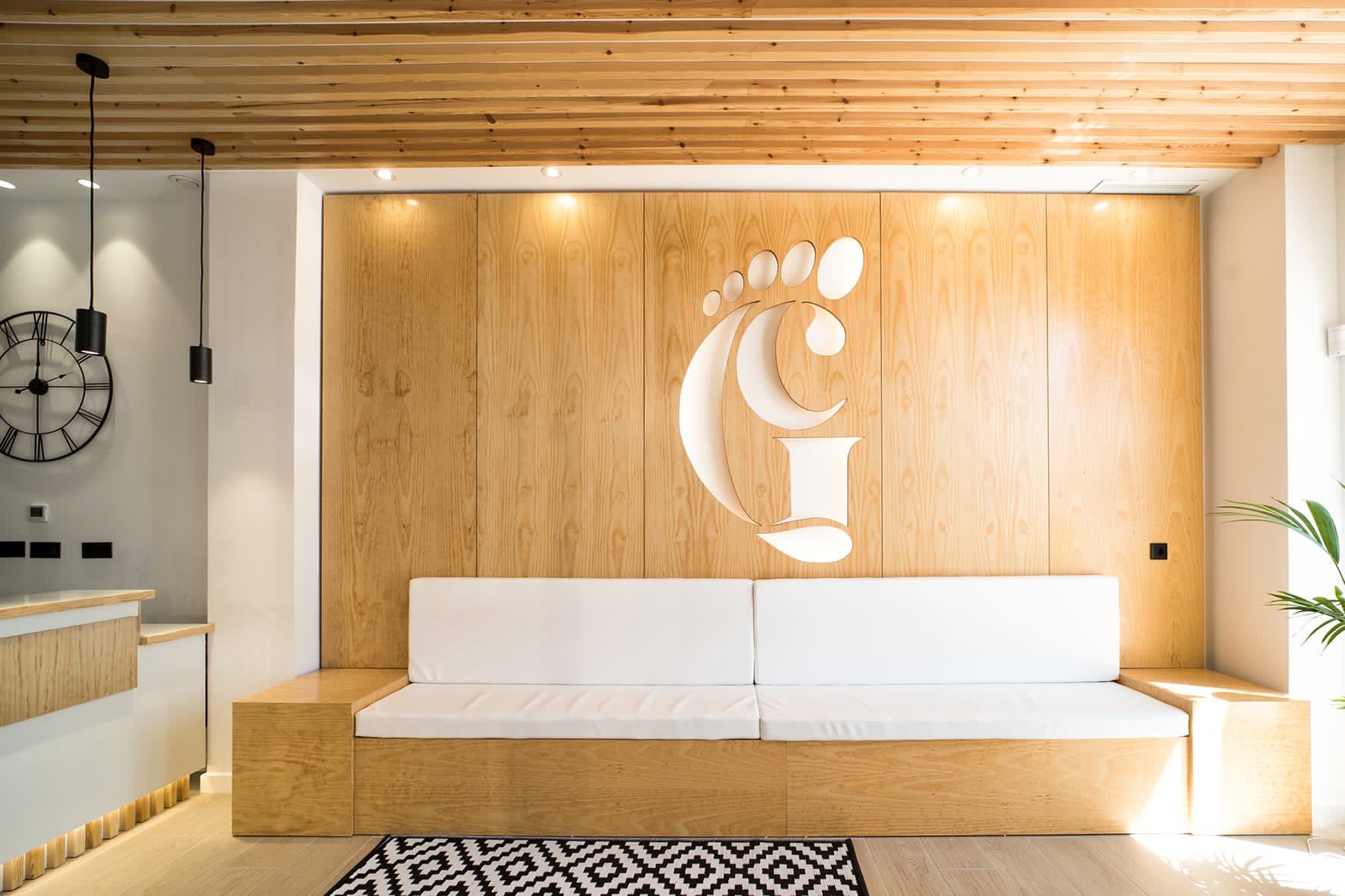 Descripción: Esta clínica podológica combina elementos geométricos en madera, creando un diseño y una identidad únicos. Su fachada, salas, pasillos y recepción reflejan armonía entre tecnología, ergonomía y estética.