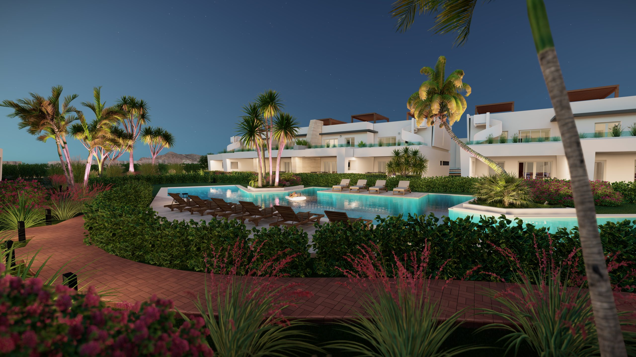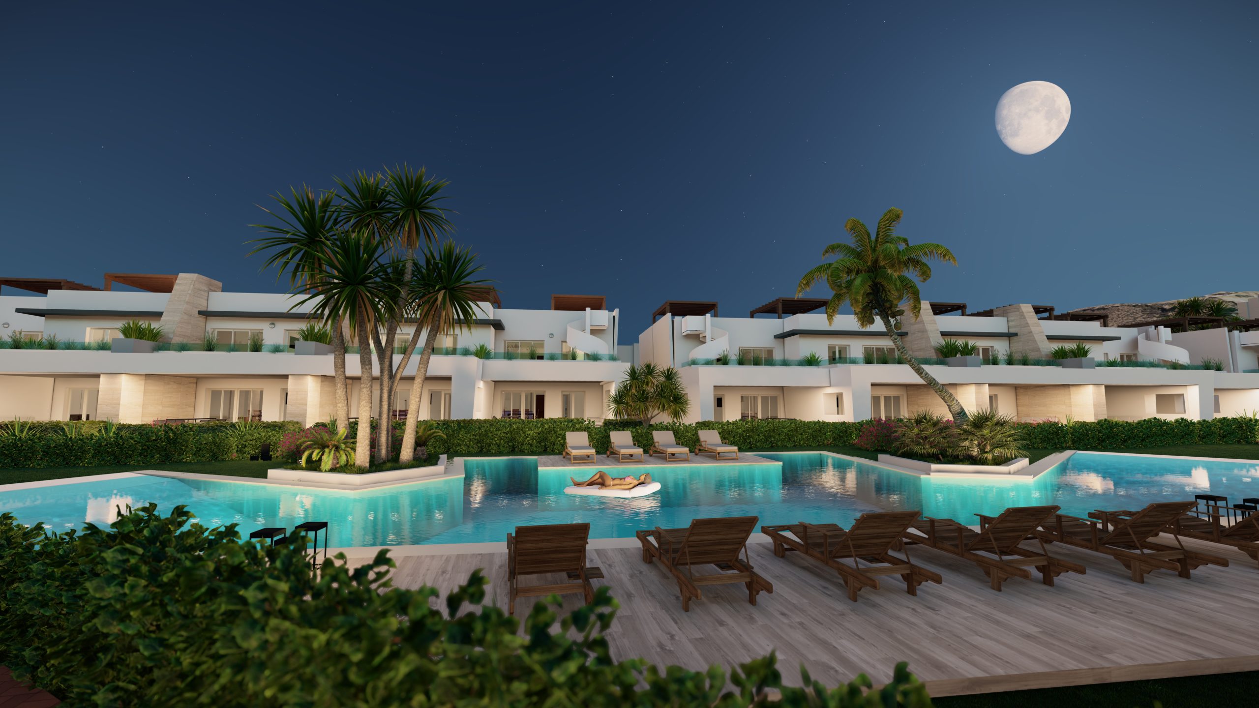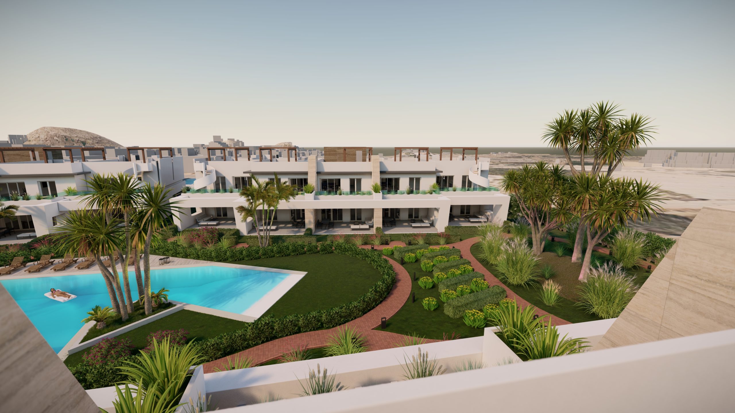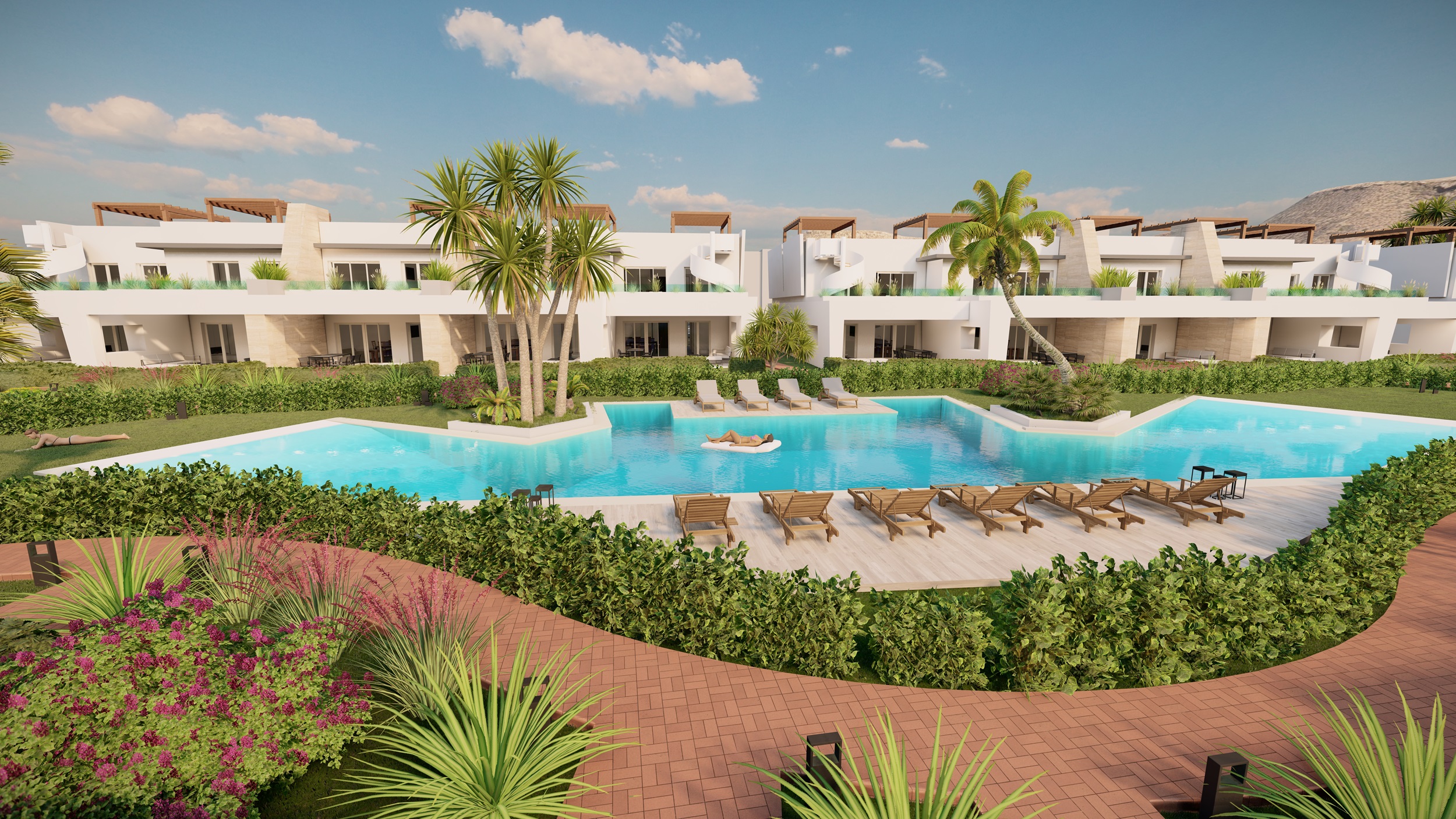 Descripción: La elegancia de este complejo residencial en San Juan de los Terreros radica en la armonía entre las amplias zonas ajardinadas, los minimalistas bloques adosados y la gran piscina central que gobierna su paisaje. Todo un lujo que combina sostenibilidad con elegancia y estética.