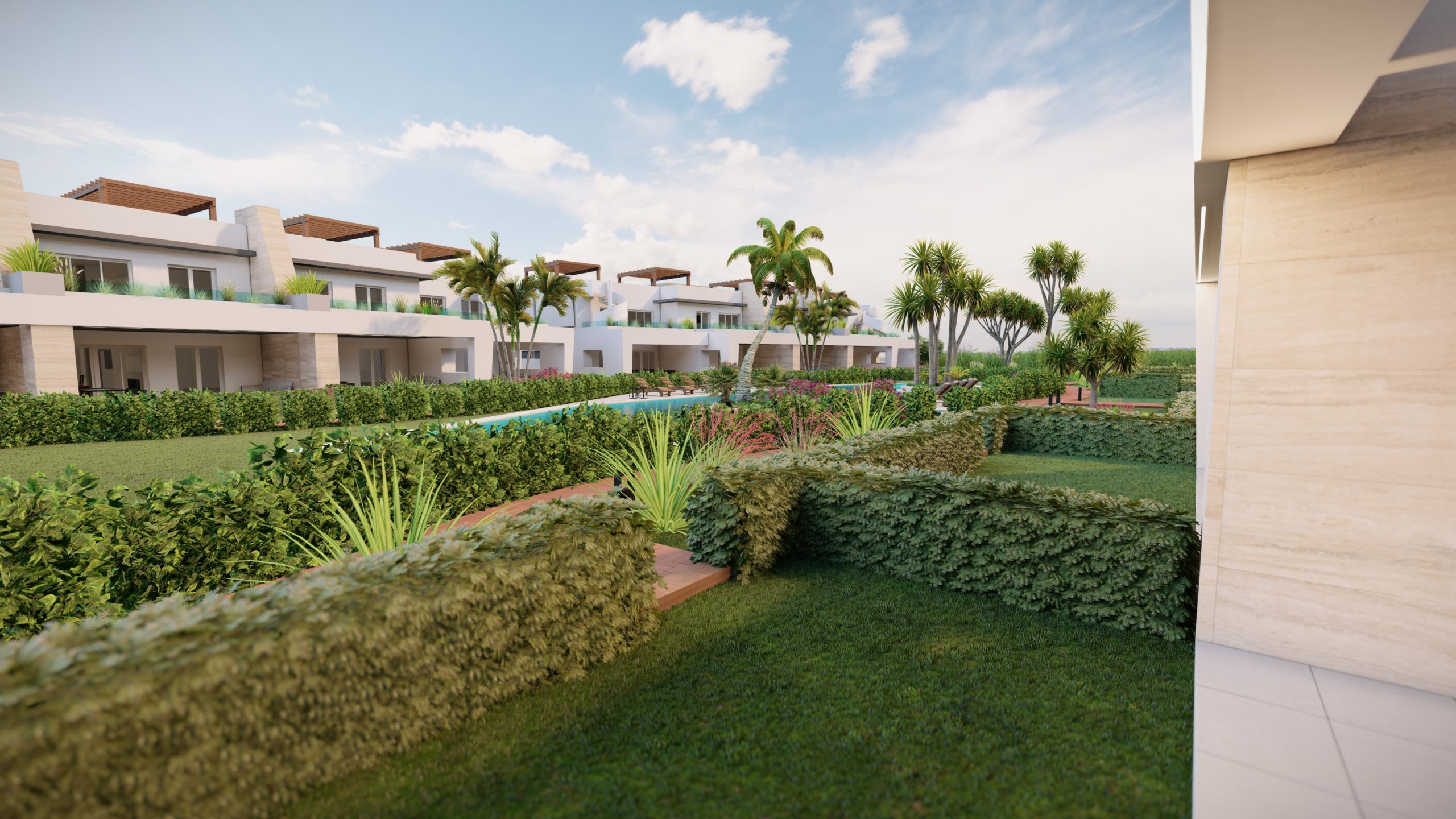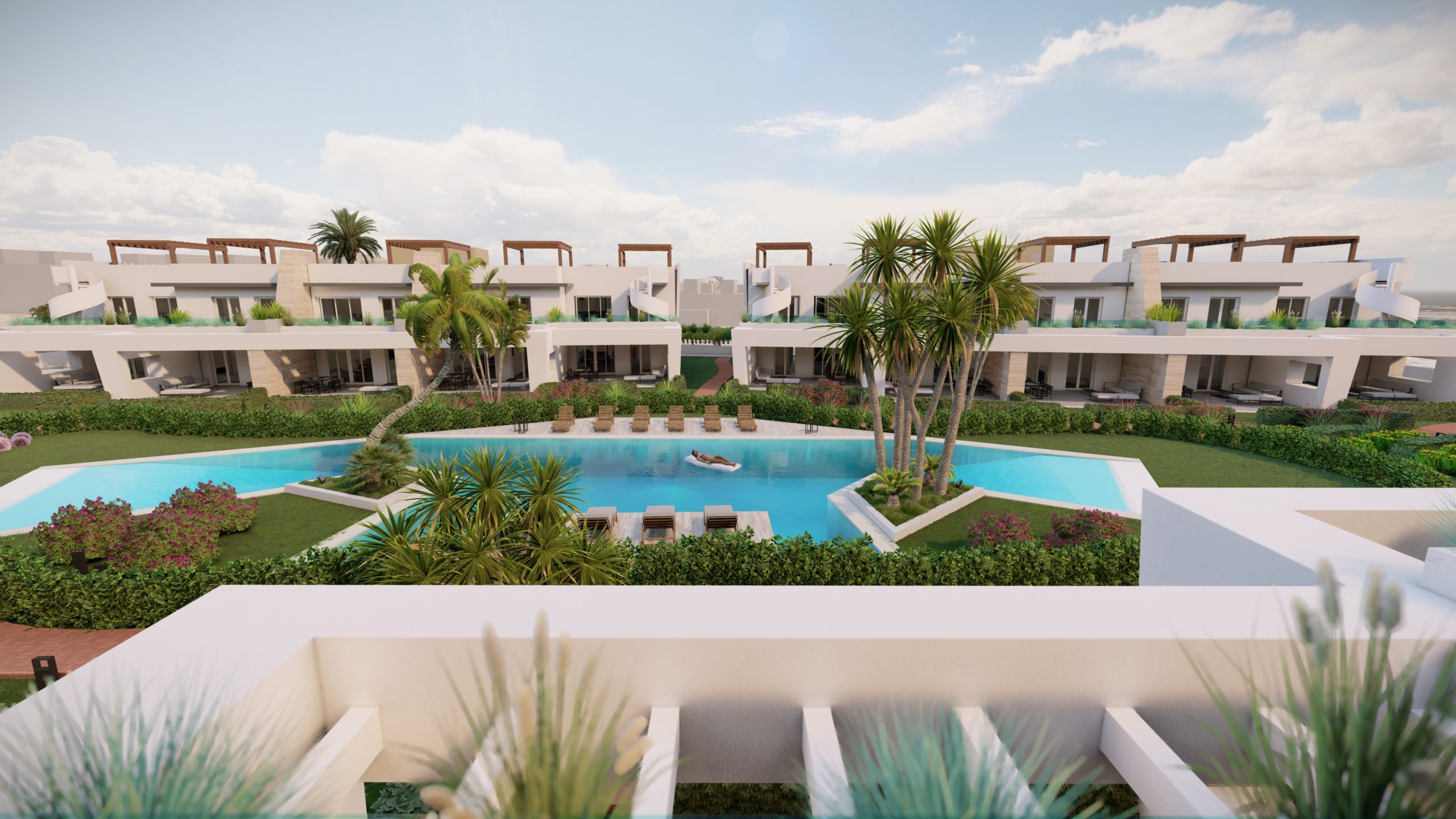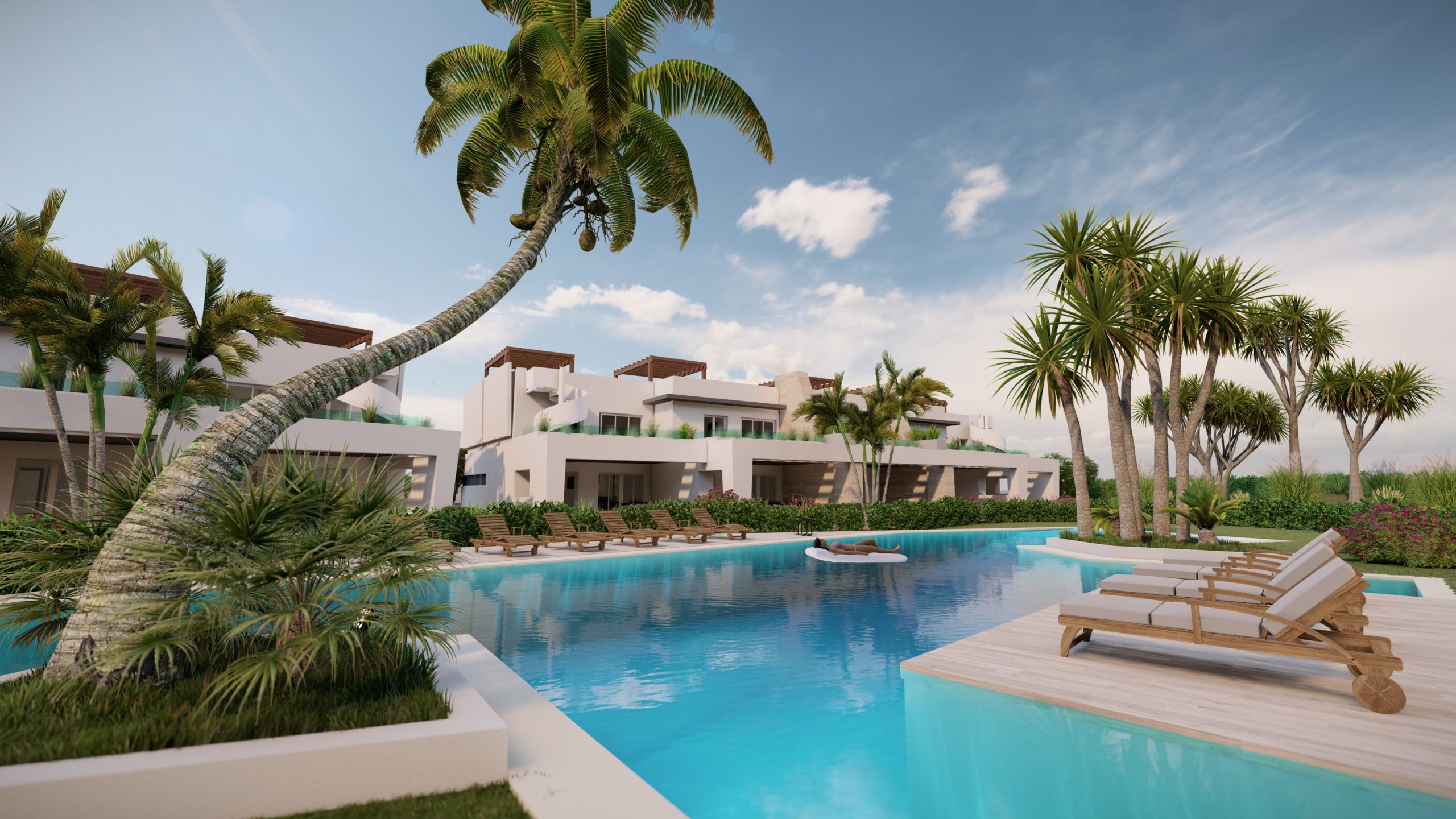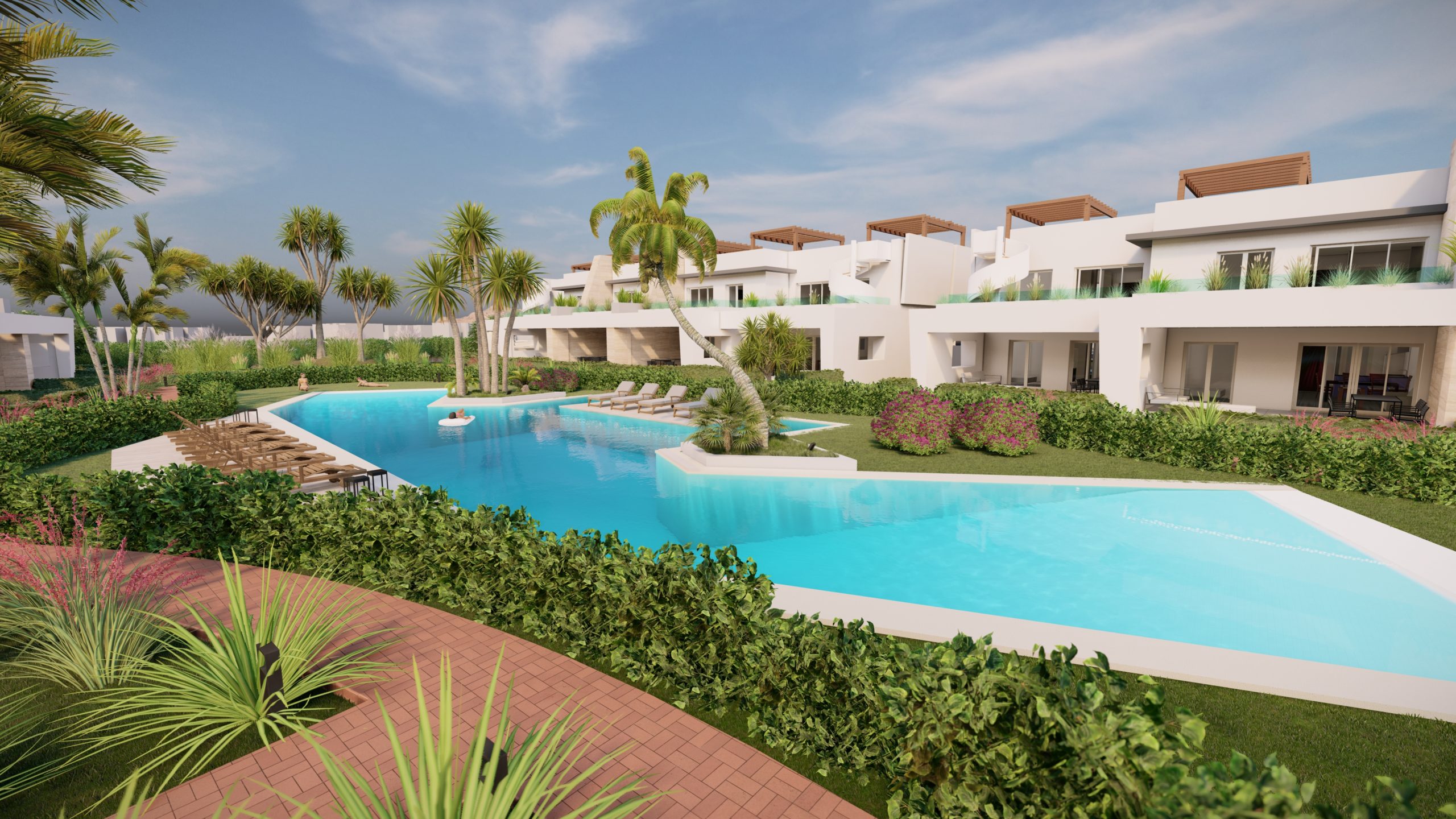 Descripción: La elegancia de este complejo residencial en San Juan de los Terreros radica en la armonía entre las amplias zonas ajardinadas, los minimalistas bloques adosados y la gran piscina central que gobierna su paisaje. Todo un lujo que combina sostenibilidad con elegancia y estética.