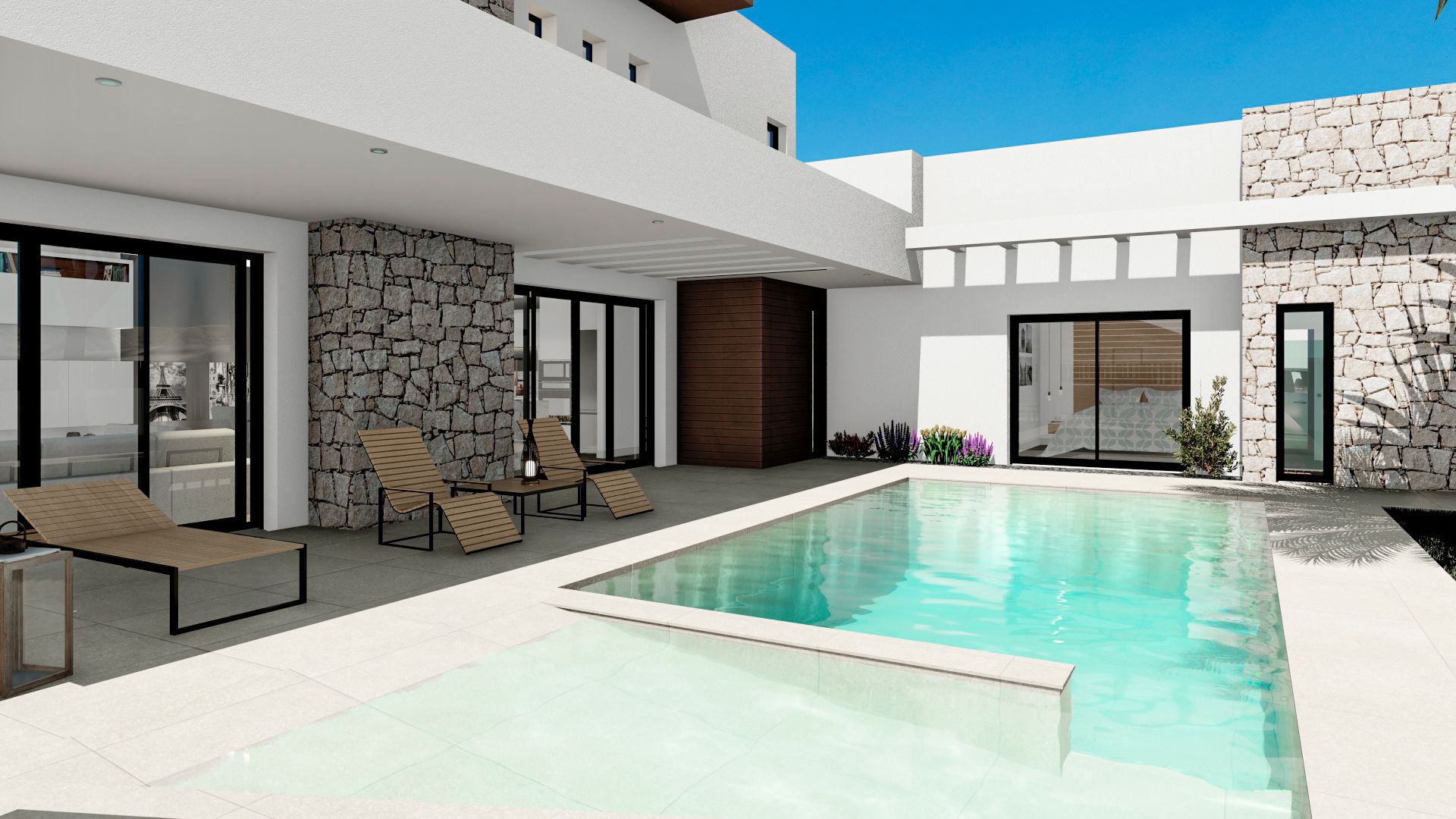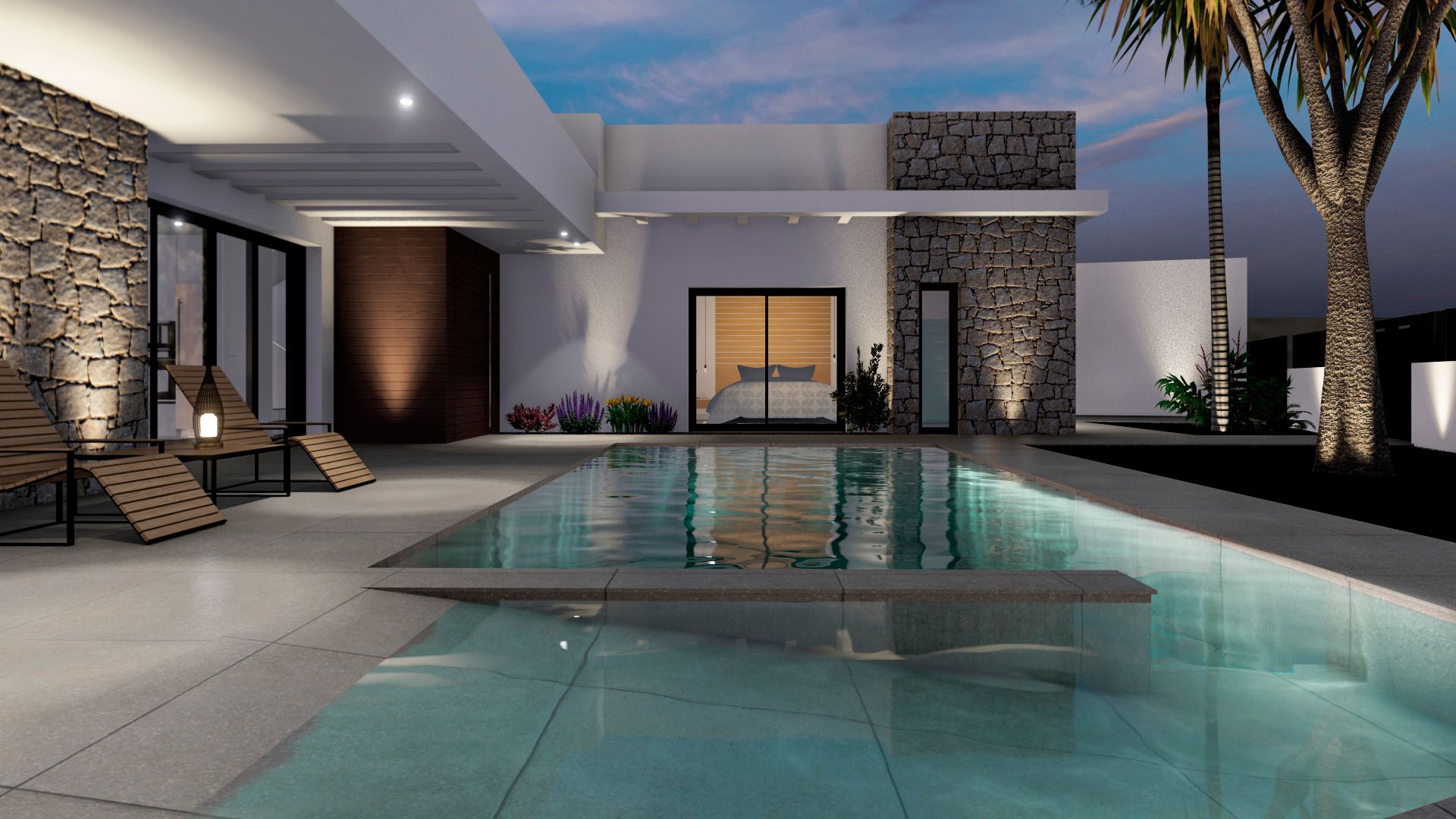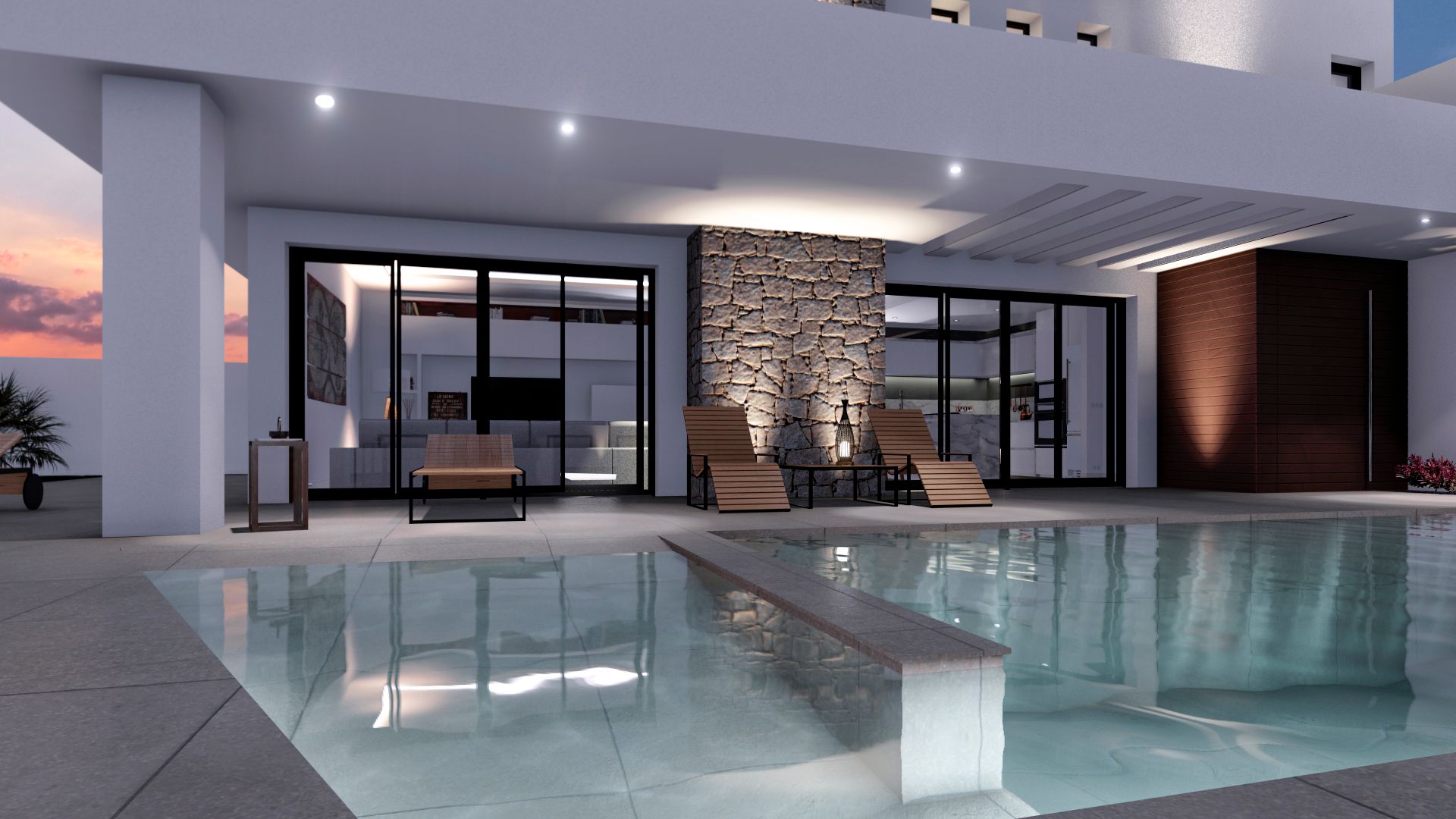 Descripción: La Vivienda Unifamiliar en Limaria destaca por su luminosidad y diseño elegante. Sus ventanales bañan de luz natural cada espacio y su lujoso patio con piscina e iluminación nocturna crea un ambiente exclusivo. El interior, minimalista y moderno, combina suelos entarimados con paredes blancas para un estilo sofisticado.